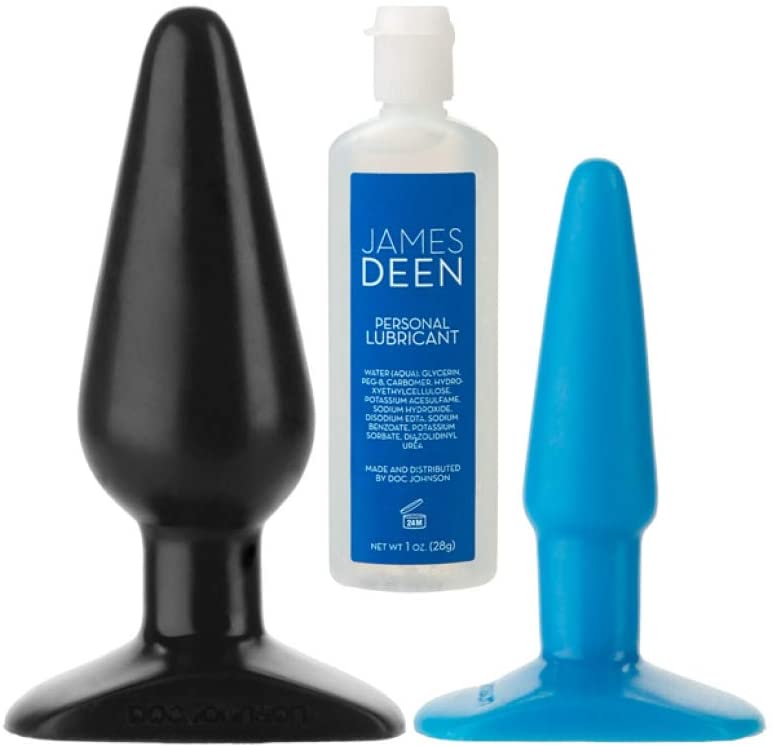 James Deen exclusive anal training kit. The three included products make training easy for beginners and enjoyable for experienced players. The kit includes a larger Platinum Premium Silicone plug that has a 5” insertable length and is a bit girthy at 1.6” in diameter; the smaller Platinum Premium Silicone plug is 4” in insertable length and has a slender diameter of 0.9”;