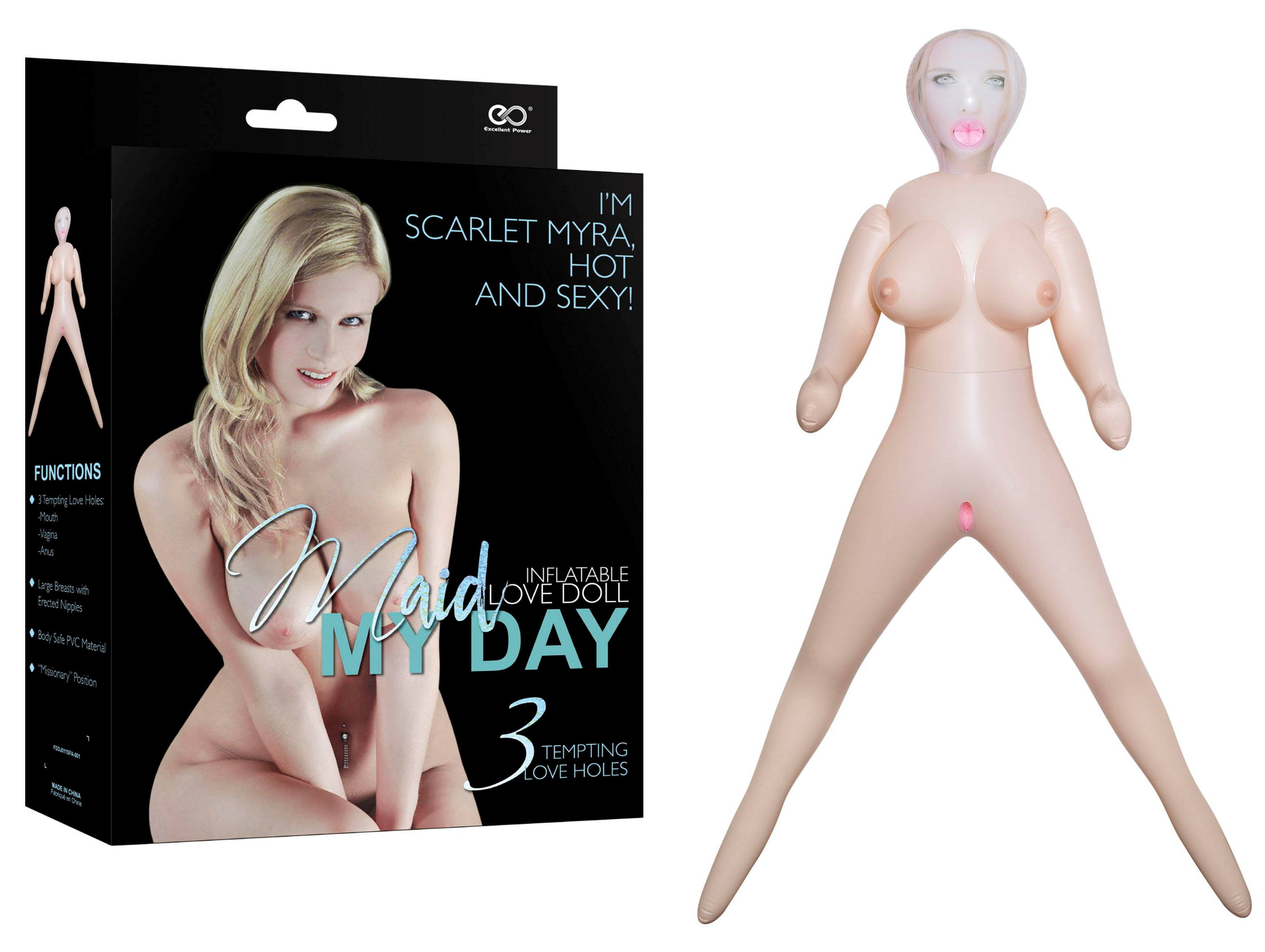 Light flesh coloured female inflatable love doll with photorealistic printed face, and perky breasts. This hot and sexy Maid my day inflatable love Doll has 3 tempting love holes.