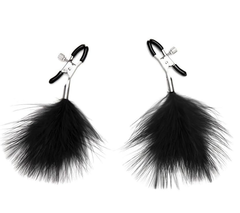 Enjoy the sensual tickling and teasing from soft feathers attached to a pair of delightfully tortuous nipple clips.