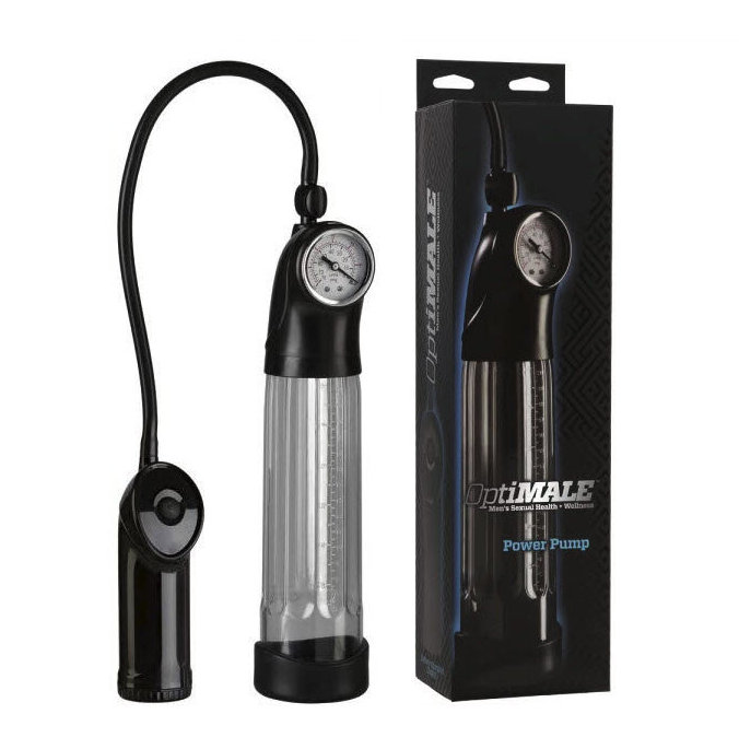Power up for bigger, thicker erections with the OptiMALE Power Pump. Watch your growth through the large, clear vacuum cylinder, featuring a soft silicone sleeve for an air-tight seal, a stylish pressure gauge, and an easy-to-read measuring guide to monitor progress. The strong auto-pump action is easily delivered with just the push of a button, and a quick-release valve button allows for customizable pressure. The Power Pump helps draw blood flow to your penis for the ultimate erection, increasing your size and sexual satisfaction! Made of phthalate-free, body-safe materials. Requires 4 AA batteries