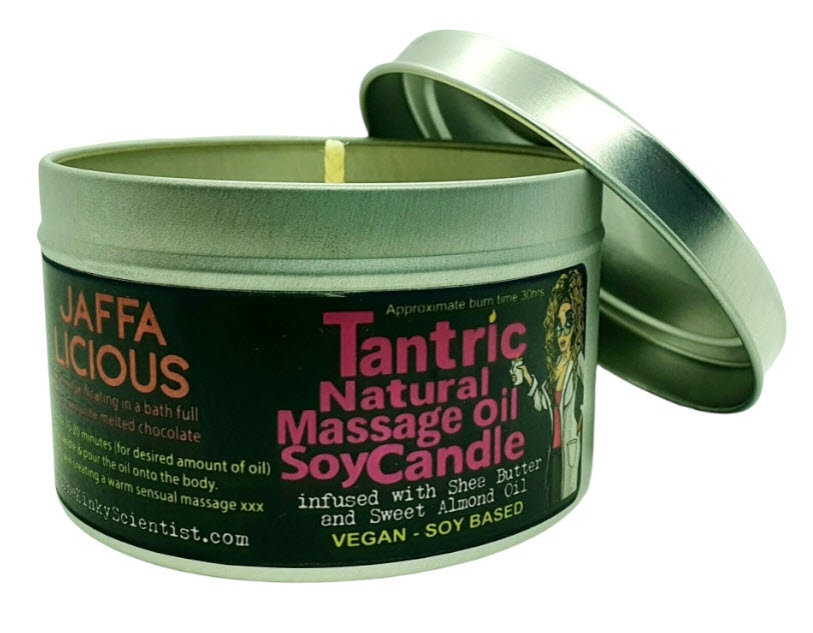 Jaffa Licious - Juicy orange floating in a bath full of your favourite melting chocolate. A candle which is infused with Shea Butter and Sweet Almond Oil. Enjoy the tantric jaffa natural soy massage oil candle as a candle, massage oil, or moisturising lotion. Apply oil directly on to your skin and feel the warmth and rejuvenation as you massage the stress of the day away.